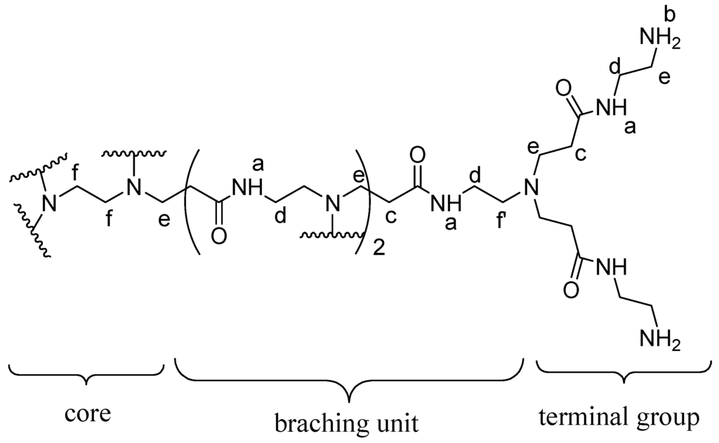 The structural analysis of synthesized dendrimer G4 as represented by atom labeled partial structure (Figure 5) is in agreement with the 1H NMR spectrum (Figure 4). The structure consists of six different types of protons. These are amido protons (a), protons at the terminal amino group (b), methylene protons adjacent to carbonyl (c), methylene protons adjacent the amido nitrogen (d), methylene protons next to terminal amino group (e), methylene protons near the tertiary amine (f′) and the methylene protons of the ethylenediaminetetraacetic acid core (f). Generally, results from the UV-Vis, IR, NMR and MALDI-TOF-MS corroborated those reported in previous studies [15,16,17,18,19,20]. Therefore, with these evidences, EDTA core PAMAM G4 dendrimer was successfully synthesized and characterized.