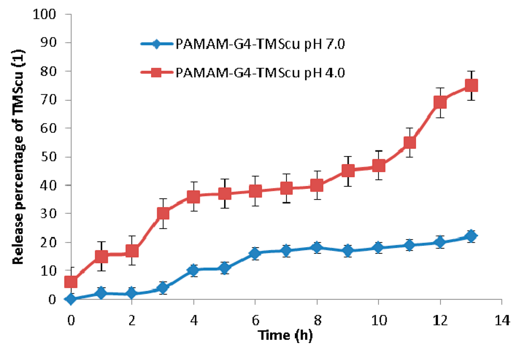 In vitro release to investigate the stability and interaction of TMScu-dendrimer complex was done in a phosphate buffered saline (PBS) media at two different pH values (4.0 and 7.0). In vitro release behavior of loaded compound is presented in Figure 11. For a period of 1 h at pH 4.0, TMScu (1) showed an initial release of 17%, which later increased up to 36% for a period of 4 h. The release was nearly maintained for 3 h (i.e., up to the seventh hour) and then progressively increased. The highest release of 75% was obtained after 13 h. However, at pH 7.0, the release of TMScu (1) was only 22% for a period of 13 h. As indicated in Figure 11, the in vitro release of the investigated compound was pH and ionic interaction dependent. This gives an implication that at pH 7 the TMScu–dendrimer complex formulation was relatively stable as few percentages of the compound were released as compared to that at pH 4. It is generally acknowledged that encapsulation of the compound by amine in basic condition prevents release from the dendrimer [26]. Once the dendrimer enter the cancerous cells or tumor cells which has acidic environment (low pH) the amino groups protonate, repel and undergoes conformational change which facilitate the release of the compounds [26]. More molecules of TMScu (1) were released at pH 4.0, implying it could also be made available to the targeted tumor cells’ physiological environment.