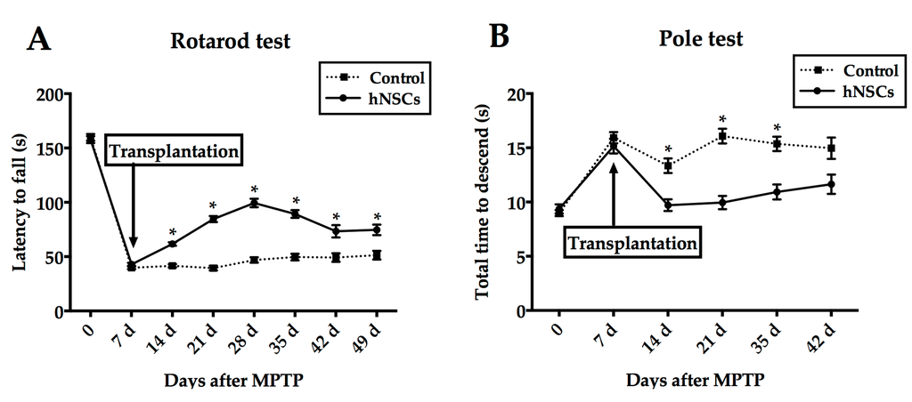 Transplantation of hNSCs (human neural stem cells) promotes functional recovery following MPTP injection. Motor performance in rotarod (A) and pole (B) tests of the hNSCs-treated or control groups demonstrated significant differences starting at 14 days after MPTP. Values represent mean ± SEM (* p < 0.05; two-way ANOVA). hNSCs, human neural stem cells; MPTP, 1-methyl-4-phenyl-1,2,3,6-tetrahydropyridine.