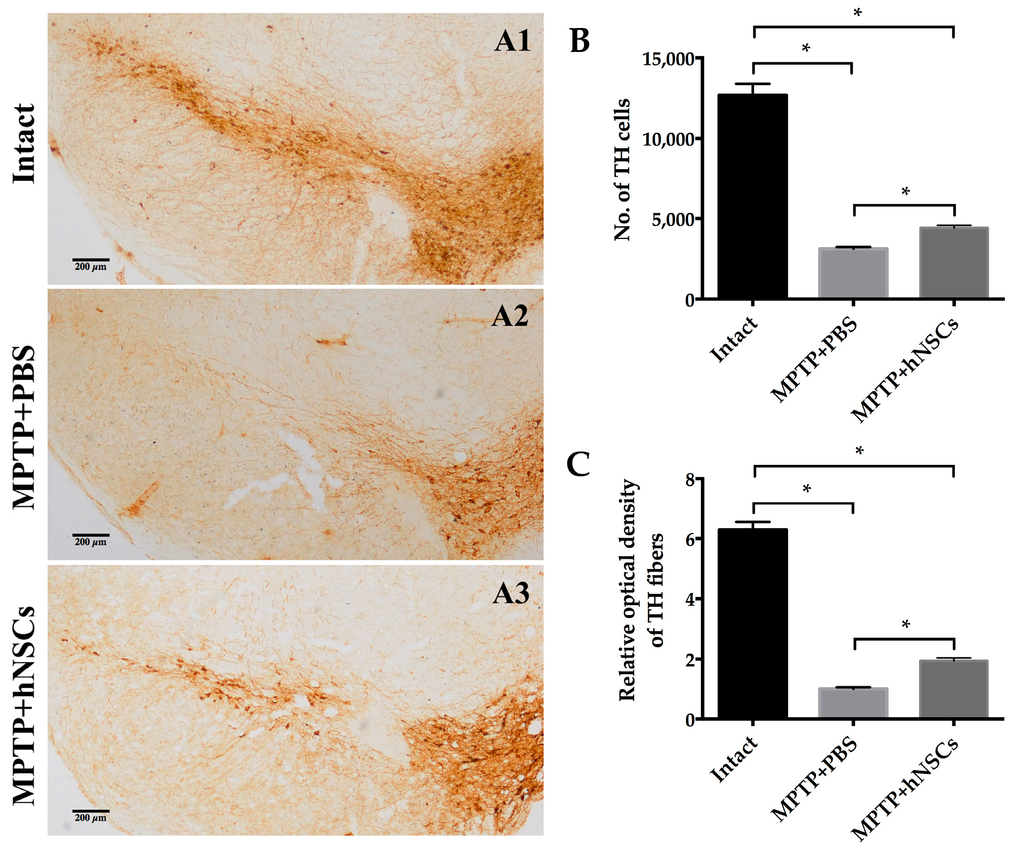 To assess effects of nigrostriatal protection, we examined the optical densities of dopaminergic axons in the striatum and stereologically counted the number of dopaminergic neurons in the SN stained for tyrosine hydroxylase (TH). At 42 days following hNSCs transplantation, there was substantial restoration of innervation (Figure 2C). Values were normalized to the mean of mice given 0.1 M phosphate buffered saline (PBS). Furthermore, hNSCs-transplanted mice had an average of 4423.53 ± 146.00 cells expressing TH in the SN when compared with vehicle-infused animals which had only 3116.89 ± 119.20 dopaminergic neurons (p < 0.05, Figure 2B).