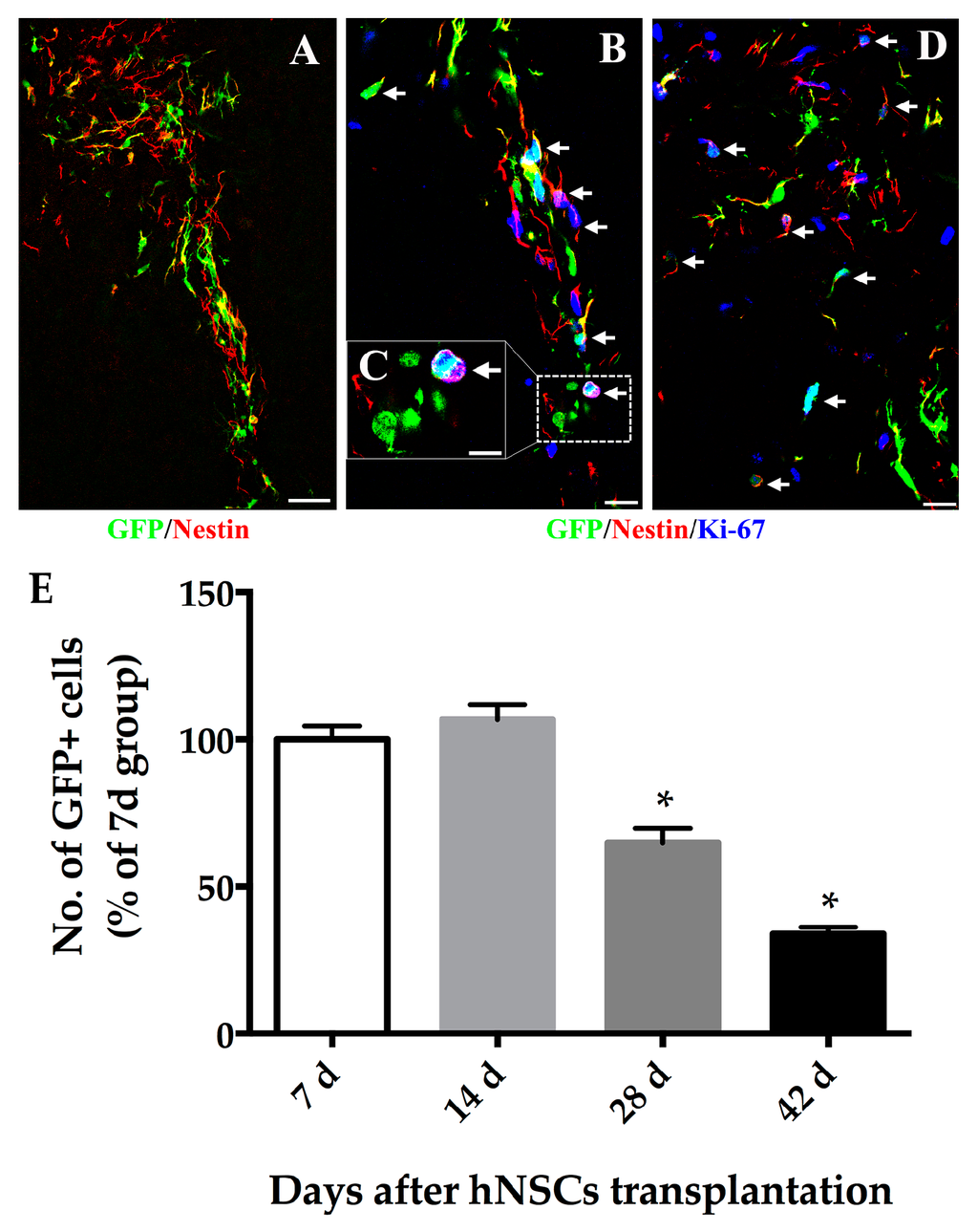 The hNSCs express the marker of neural precursor cell and proliferate at an early stage following transplantation. Immunofluorescence staining showed that a large number of GFP positive hNSCs (A–D; green) expressed Nestin (A–D; red), some of which co-labeled with Ki-67 (B–D, blue). At 7 days post-transplantation (B), the hNSCs dispersed along the grafted core which accommodated some of GFP/Nestin/Ki-67 positive cells (arrows); (C) Higher magnification images of the boxed areas in (B) demonstrated one representative proliferating stem cell (arrow) with enlarged double nuclei; (D) At 14 days post-transplantation, some grafted cells still expressed Nestin, which demonstrated that they were at the early stage of neurogenesis and remained poorly differentiated. Scale bars represent 50 μm in (A); 20 μm in (B,D); 10 μm in (C); (E) Grafted cells survived well for at least 14 days, but significantly fewer cells survived 28 and 42 days following treatment. Cell number was expressed as percentage of day-7 group. Values represent mean ± SEM (* p < 0.05; two-tailed Student’s t-test). GFP, green fluorescent protein.
