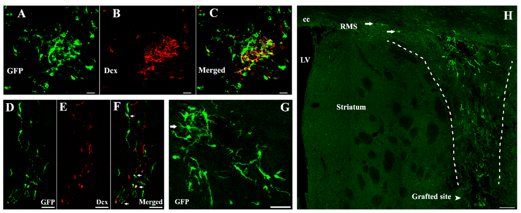 In terms of migration of grafted cells, hNSCs seemed to be broadly distributed around the transplanted core in the striatum (Figure 4). Many of the migrating cells expressed nestin, some of which co-labeled with Ki-67 (Figure 3). At 14 days post-treatment, grafted cells mainly dispersed along the grafted trajectory and migrated towards the corpus callosum (cc) or even connected with the rostral migratory stream (RMS) (Figure 4H). Typically, these cells were of an elongated shape, which sprouted and extended their neurites, pointing in the direction of migration. Grafts were strongly immunoreactive to doublecortin (Dcx) (54.49% ± 3.15% of green fluorescent protein (GFP) positive cells) accompanying cell migration since 14 days post-treatment (Figure 4). However, no astrocytic differentiation was observed because grafted cells did not stain for glial fibrillary acidic protein (GFAP) at all time points.