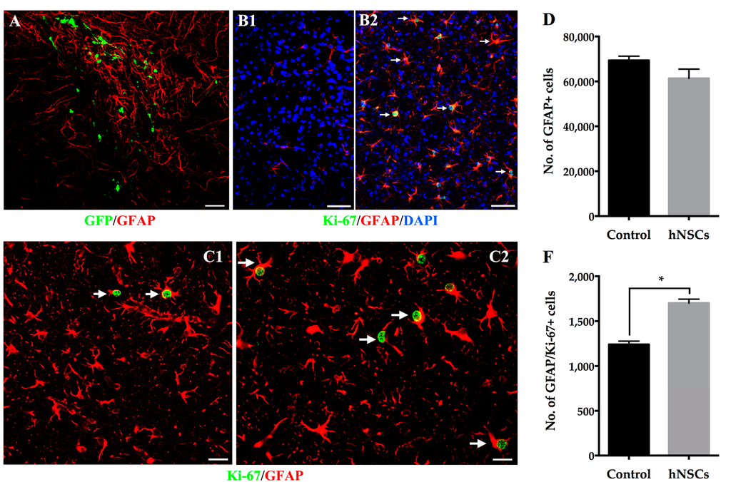 Striatal astrocytes in response to hNSCs transplantation. (A) Local GFAP positive astrocytes (red) accumulated around the xenografts (GFP, green) when the hNSCs continued to migrate within the striatum 14 days following treatment. Most of the astrocytes (B2, red) co-localized with Ki-67 (B2, green), indicating that they became reactive and re-exhibited proliferative capacity, whereas few astrocytes could be found in the striatum of intact animal without MPTP (B1). Cell nuclei were counterstained with DAPI (blue). Moreover, the astrocytes displayed hypertrophic cell bodies with thick processes (arrows in C). More Ki-67 positive astrocytes were observed in the striatum of mice receiving hNSCs (C2) compared with animals given vehicle (C1) 14 days after transplantation. Although no significant difference of GFAP positive cell number was observed in hNSCs-treated mice when compared with animals given vehicle (D), there was a greater increase of Ki-67/GFAP positive cells in the striatum of treated mice (F). Data are expressed as mean ± SEM (* p < 0.05; two-tailed Student’s t-test). Scale bars represent 50 μm in (A,B); 20 μm in (C). GFAP, glial fibrillary acidic protein. DAPI, 4′,6-diamidino-2-phenylindole.