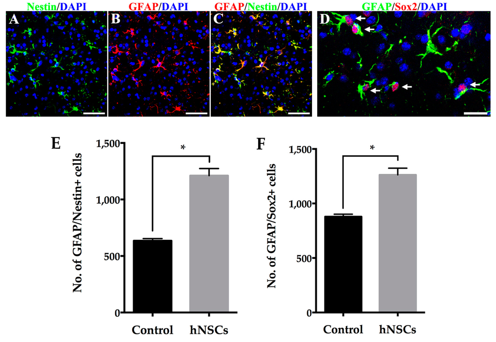 hNSCs transplantation promote de-differentiation of host-derived astrocytes in the striatum. A large number of GFAP positive astrocytes (B,C, red) expressed intermediate filament Nestin (A,C, green). Furthermore, most local astrocytes (arrows in D, green) co-localized with transcription factor Sox2 (arrows in D, red), suggesting that they de-differentiated into a phenotype resembling RGCs that were shown to be transient NPCs. Cell nuclei were counterstained with DAPI (blue) (A–D); Quantification of GFAP/Nestin positive cells (E) and GFAP/Sox2 positive cells (F) in the striatum showed significantly more EDAs in hNSCs-treated mice compared with the control animals. Bars represent mean ± SEM (* p < 0.05; two-tailed Student’s t-test). Scale bars represent 50 μm in (A–C); 20 μm in (D). RGCs, radial glial cells; NPCs, neural precursor cells; EDAs, endogenous de-differentiated astrocytes.