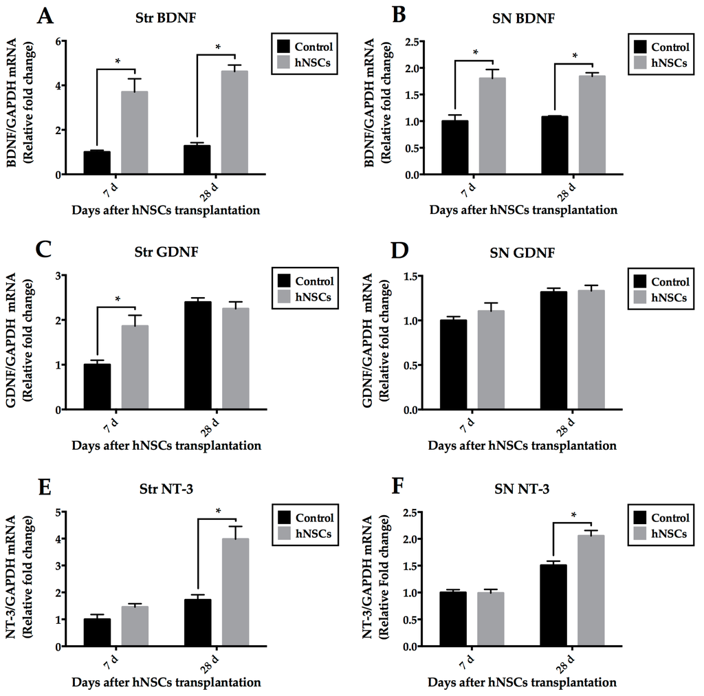 QRT-PCR analysis of host-derived BDNF, GDNF, and NT-3 mRNA levels in different tissues (Str and SN). BDNF was significantly up-regulated at each time point in mice receiving hNSCs (A,B); The effect was also seen in the treated mice with a trend towards greater increase of NT-3 mRNA levels compared with control mice, but it did not achieve significant difference at seven days (E,F); No difference of GDNF levels was observed at each time point except for expression at seven days in the striatum (C,D). All results were normalized to GAPDH mRNA levels and expressed as relative fold change to the levels at 7-day of the control group. Data are expressed as mean ± SEM (* p < 0.05; two-way ANOVA). QRT-PCR, real time quantitative reverse transcriptase polymerase chain reaction; BDNF, brain-derived neurotrophic factor; GDNF, glial cell line-derived neurotrophic factor; NT-3, neurotrophin-3; Str, striatum; SN, substantia nigra; GAPDH, Glyceraldehyde 3-phosphate dehydrogenase.