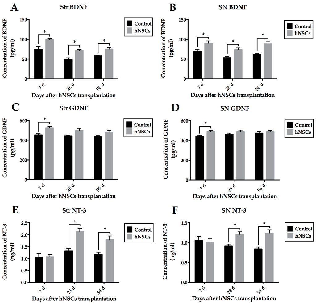 Detection of BDNF, GDNF, and NT-3 protein levels in different tissues (Str and SN) by ELISA. Transplantation of hNSCs induced significant increases in BDNF (A,B) and NT-3 (E,F) protein expression, when compared with vehicle-treated control group. Although hNSCs treatment significantly induced production of GDNF at seven days, compared with control group, there was no difference of GDNF protein level at later stages (C,D). Data are displayed as mean ± SEM (* p < 0.05; two-way ANOVA). ELISA, enzyme-linked immunosorbent assay.