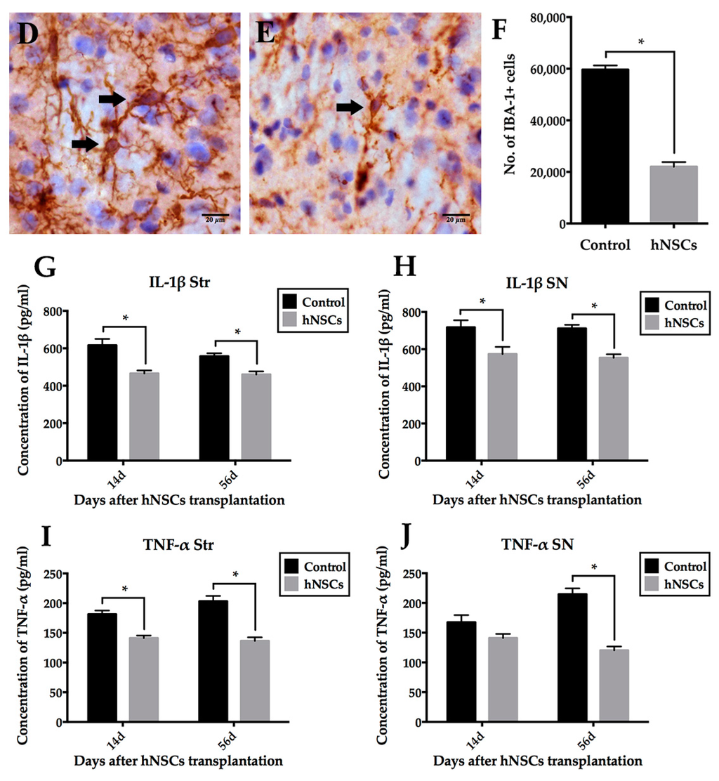 Overall, there was a significantly reduced microglial reaction in the striatum of hNSCs-treated mice (30,674.52 ± 2061.42) in contrast to the control (69,372.55 ± 1870.38, mainly presenting activated shape) (p < 0.05, Figure 9), suggesting that transplantation exerted a dampening influence on host inflammation. A substantial proportion of ionized calcium-binding adapter molecule 1 (IBA-1) positive microglia presented fully active phagocytic forms in control mice (Figure 9D). The ramified microglia (resting state of microglia) were identified in the surrounding grafted area in animals given hNSCs (Figure 9E). All of the IBA-1 positive microglia were host-derived without expressing GFP. No IBA-1 positive microglia co-labeled with Nestin or Sox2, demonstrating that the reactive cells did not revert to an immature state. Additionally, protein content of IL-1β and TNF-α was downregulated in the striatum and SN of mice receiving hNSCs compared with the control animals (Figure 9G–J).