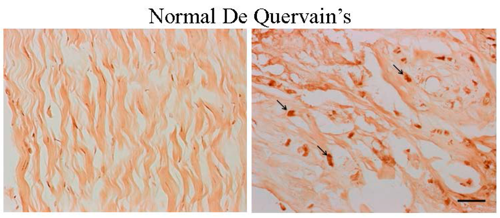 Following Institutional Review Board approval, we enrolled and analyzed 16 patients who had been diagnosed with de Quervain’s disease and underwent surgery between 9 January and 4 December 2014, in the Orthopedics Department at our hospital. Healthy tissue samples of retinaculum for the control group were obtained from three fresh cadavers. The specimens from patients and controls were histologically and immunohistochemically compared. This prognostic study investigates the pathogenesis of de Quervain’s disease (Level II of Evidence). Patients who had previous trauma or surgery on the dorsal compartments of their wrists and patients with systemic inflammatory disorders were not included in the study. Ethical approval was provided by the Institutional Review Board of National Cheng-Kung University Hospital in 20 December, 2013 (IRB number: ER-102-241).