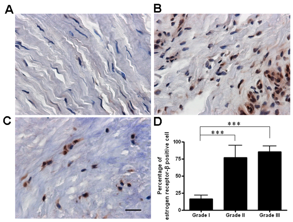 The percentage of ER-β-positive cells in grade I samples (A) was lower than in grade II (B) and grade III (C) samples (immunohistochemical staining, 400× magnification, scale bar = 10 μm); and (D) There were significantly more ER-β-positive cells in grade II and grade III areas than in grade I areas. The positive percentage was calculated as: (number of positive cells/total cells) × 100%. Data are mean ± standard deviation. *** p < 0.001.