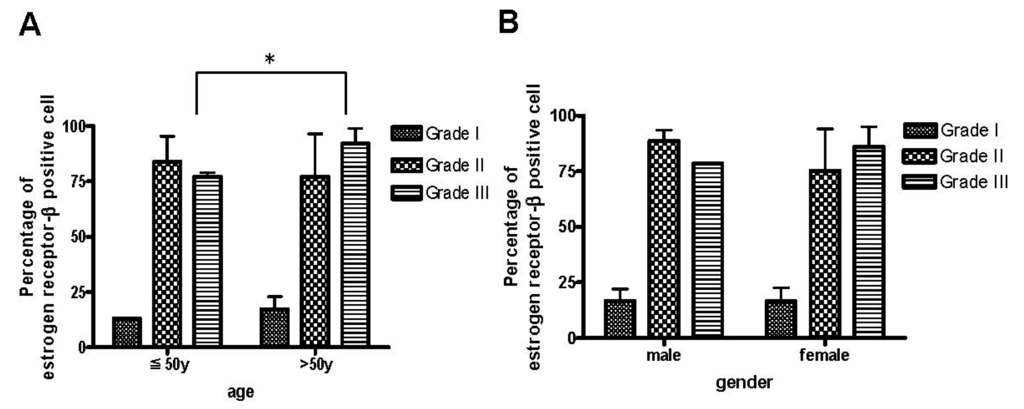We also analyzed factors related to the expression of ER-β. In grades I and II, there was no significant difference in the rate of expression of ER-β in the two different age groups. The expression of ER-β-positive cells was higher in grade III areas in patients >50 years old (92.03% ± 6.90%) than in those ≤50 (77.22% ± 1.69%) (p = 0.047) (Figure 3A). Our results suggested that age may affect the degree of ER-β expression and disease severity. Because only two of our 16 patients were men, there was no significant difference in the rate of expression of ER-β between men and women (Figure 3B).