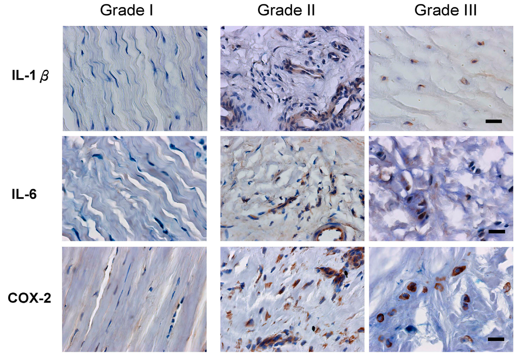 Immunochemical staining showed that the increased expression of three inflammatory factors (interleukin (IL)-1β, IL-6, and COX-2) was shown in grade II and III samples (Figure 4). The rates of expression of IL-1β and IL-6 in grade II samples (67.65% ± 16.17%, 67.23% ± 17.63%, respectively) and grade III samples (89.43% ± 8.53%, 84.16% ± 10.41%, respectively) were significantly higher than in grade I samples (13.08% ± 5.75%, 12.29% ± 8.72%, respectively) (Table 2). There were also significantly more COX-2-positive cells in grades II and III samples (87.07% ± 7.64%, 92.69% ± 5.51%, respectively) than in grade I samples (8.81% ± 6.87%).