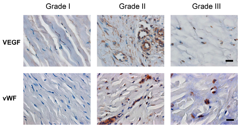 VEGF expression and vessel density in tissue samples of retinaculum were dependent upon disease severity. Serial sections of three grades (I–III) were stained with vascular endothelial growth factor (VEGF) and Von Willebrand’s factor (vWF) antibodies. More blood vessels were distributed in the grade II and grade III tissues of retinaculum (immunohistochemical staining, 400× magnification, scale bar = 10 μm).