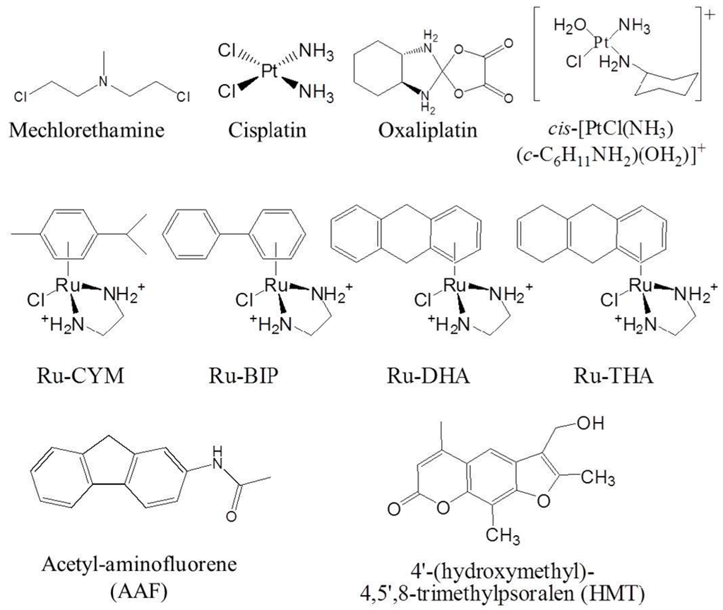 Other transition-metal antitumor agents also alkylate guanines in the major groove at N7 position and unwind DNA as using Ru-CYM, Ru-BIP, Ru-DHA, Ru-THA and monodentate-Ru(II) [13,14,15]. This is the case of acetyl-aminofluorene (AAF) (Figure 1) that reduced by 12 to 18 °C the melting temperature of different double stranded DNAs [16,17].