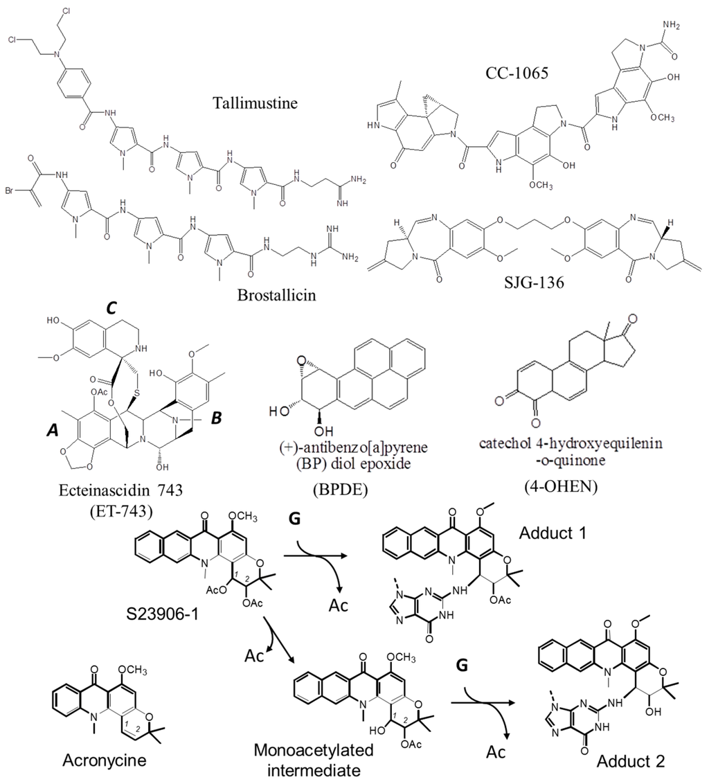 In contrast to the vast number of major groove alkylating agents depicted in literature, only a few compounds target the DNA helix through covalent bonding orientated in the minor groove. This is the case for the clinically used drug Ecteinascidin 743 (ET-743, Trabectedin, YondelisTM (PharmaMar, Madrid, Spain and Janssen Biotech Inc., Horsham, PA, USA), or for the distamycin derivatives tallimustine (PNU152241) and brostallicin (PNU-166196, CTI BioPharma Corp., Seattle, WA, USA) [21,22], as well as for the cyclopropylindol CC-1065, the pyrrolobenzodiazepin dimer SJG-136 (NSC694501, Spirogen, London, UK) [23,24] and the benzoacronycine derivative S23906-1 (cis-1,2-diacetoxy-1,2-dihydro-benzo-[b]-acronycine, licensed by Servier) that entered either preclinical or phase I/II clinical trials (Figure 2). Both distamycin derivatives and CC-1065 target guanines or adenines through covalent bonding at the N3 position and subsequently bend the DNA axis in a manner that is associated with local stabilization of the double-stranded DNA helix [25]. Both ET-743, SJG-136 and S23906-1 covalently bond DNA at the exocyclic amino-group of guanines localized in the minor groove [23,24,26,27,28,29]. However, those NH2 adducts differ on the global 3D structure of the DNA helix: ET-743 and SJG-136 stabilize the DNA helix [23,30], whereas S23906 destabilizes the hydrogen bonds between the two DNA strands [30]. S23906-1 forms two types of adducts with guanines depending on deacetylation occurring during the guanine alkylation process (adduct 1) or reacting with water first (spontaneous deacetylation process to form a monoacetylated intermediate) followed by a transesterification process that then allows alkylation at guanine residues to form adduct 2 (Figure 2) [27,28,29].