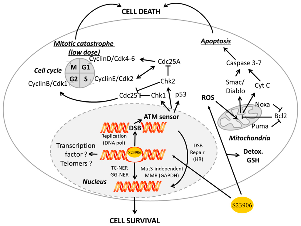 General scheme of S23906-1 cellular mechanism of action and repair. ROS, reactive oxygen species; CytC, cytochrome C; Detox, detoxification process; DSB, double strand break; DNApol, DNA polymerase; TC-NER, transcription-coupled nucleotide excision repair; GG-NER, global genome nucleotide excision repair; MMR, mismatch repair; HR, homologous repair. Solid and dash circles represent the cellular membrane and the nucleus, respectively. M, G1, S and G2 correspond to the different phases of the cell cycle. Open arrows and stop arrows correspond to activation and inhibition, respectively.