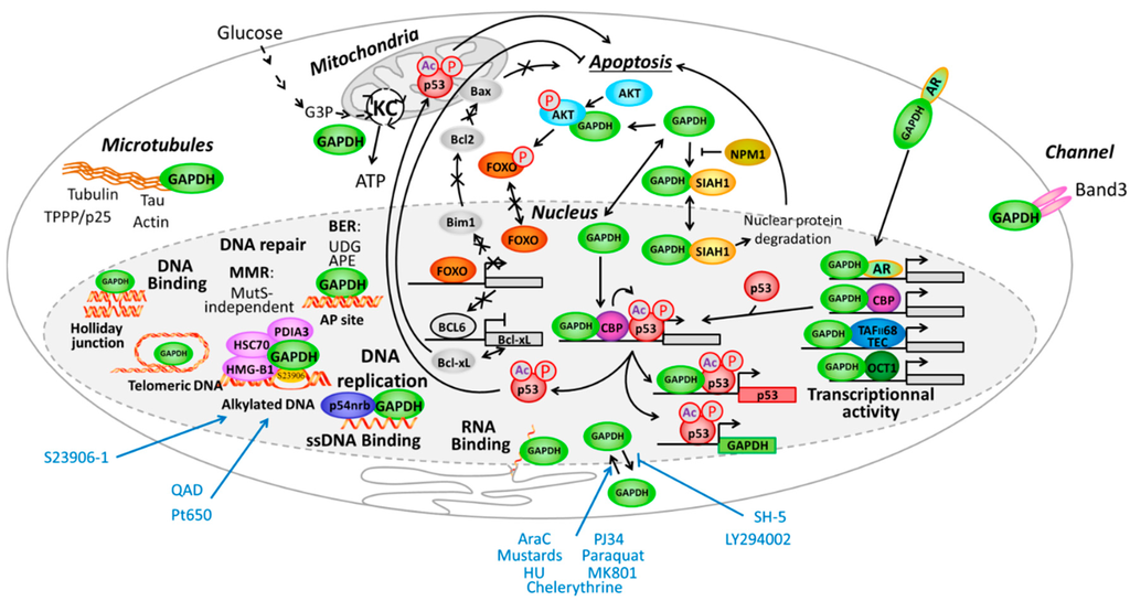 - In parallel, interaction of GAPDH with P-AKT inhibits GAPDH nuclear translocation and subsequent acetylation/phosphorylation of p53 that further translocates in the mitochondria to initiate apoptosis [127].
