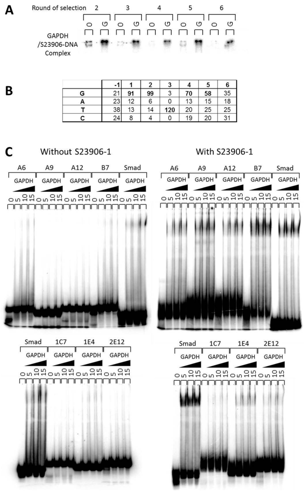 Binding of glyceraldehyde-3-phosphate dehydrogenase (GAPDH) to S23906-1 DNA adducts. (A) Increased selectivity for adduct recognition in the course of binding site selection is visualized upon migration of the radiolabeled mixture of DNA with GAPDH (5 μg) on a native 6% polyacrylamide gel. “0” and “G” refer to the absence or presence of GAPDH proteins; (B) Determination of the preferential binding site upon alignment of the amplified sequences; (C) EMSAs evidence a differential complexation efficiency of GAPDH on S23906-1 alkylated (labeled “with S23906-1”) or unalkylated (labeled “without S23906-1”) using various DNA sequences from [176] and comparison with the reference DNA Smad-SBE (Smad).