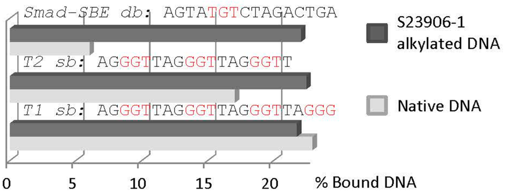 In parallel, we searched for potential inhibition of transcription factor/DNA binding inhibition using HeLa nuclear extracts and Transignal Protein/DNA Arrays from Panomics but also evaluated the impact of GAPDH binding to this pool of alkylated transcription factor binding sequences as a mixture of S23906-1 alkylated DNA sequences. Representative results were presented in Figure 5 and Figure S1 of reference [176]. Such analyses evidenced that GAPDH binds more strongly to alkylated Smad-SBE sequence rather than non-alkylated one (Figure 5C and unpublished data). Such enhancement was not obtained using telomere sequences of three (T2) or four (T1) guanine stretches for which GAPDH binding is similar between alkylated and non-alkylated DNAs (Figure 6).