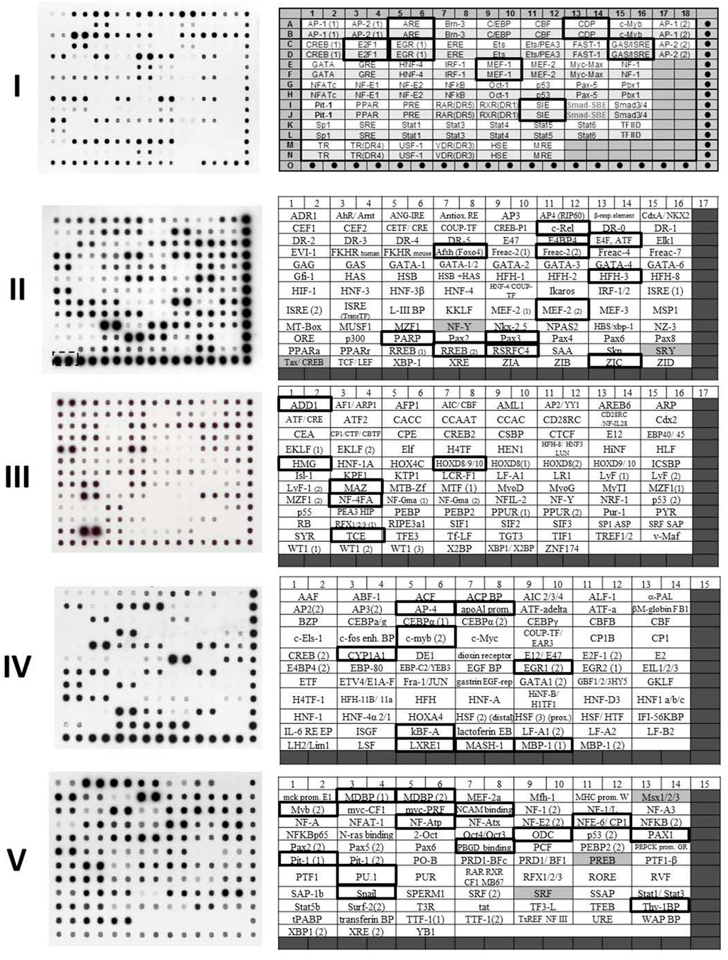Transignal protein/DNA arrays using GAPDH and unalkylated DNA oligonucleotides. The experiments were performed as presented in [176]. In Transignal membrane I (labeled “I”), dot-containing boxes correspond to hybridization controls and the target sequences for each transcription factor are spotted four times: the two upper spot being 10 fold more concentrated (white boxes) than the two lower ones (light grey boxes). In Transignal membrane II to V (labeled “II” to “V”), the hybridization controls are localized in dark grey boxes and the target sequences for each transcription factor are spotted in duplicate at equal concentrations. Positions identified using black rectangles correspond to those for which a stronger GAPDH/DNA complex could be identified. The corresponding DNA sequences are presented in Table 1.
