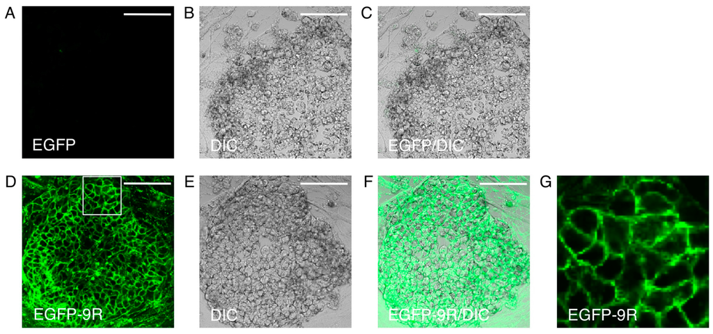 Protein transduction into human iPS cells. Human iPS cells of 201B7 were treated with EGFP or 9R-EGFP for 6 h at a final concentration of 1 µM and GFP fluorescence was analyzed by confocal microscopy. (A–C) EGFP-treated cells. Images of EGFP fluorescence (A); DIC (B) and their merge (C) were shown. (D–F) EGFP-9R-treated cells. Images of EGFP fluorescence (D); DIC (E) and their merge (F) were shown; (G) Magnified image of indicated area by white box in (D). GFP fluorescence was detected in the cytoplasm and cell membrane. Scale bars are 100 µm. 9R, nine arginines. DIC, differential interference contrast.