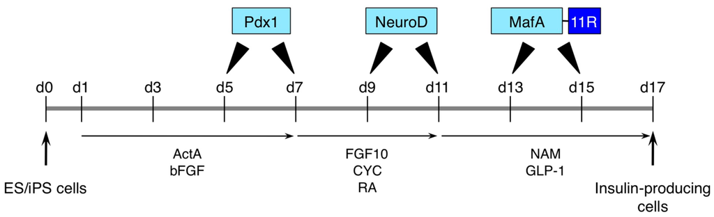 In the general method, some cytokines and growth factors are used to mimic organ development in pluripotent stem cells and direct the differentiation into specific cell types. Small molecules are also used to inhibit selective molecular signaling and guide to specific molecular activation. There have been several reports of efficient methods promoting differentiation from human iPS cells into neurons [], retinal cells [], lung cells [], and pancreatic β cells [], using some cytokines, growth factors, and small molecules. In addition to these biological factors and chemicals, the protein transduction of specific transcription factors is a useful method for directing the differentiation. We previously developed a differentiation method by the step-wise transduction of recombinant Pdx1, NeuroD, and MafA-11R proteins []. Pdx1 and NeuroD have their own PTDs [,], while MafA is fused with 11 arginines (11R) as CPPs. In mouse ES cells, these three proteins improved the efficiency of differentiation into insulin-producing cells (Figure 3) []. In human iPS cells, culture in differentiation medium with recombinant Pdx1 facilitates differentiation into pancreatic endocrine progenitors []. In this method, the order of transduced proteins and timing of protein transduction are important components for efficient differentiation. The protocol of Pdx1 transduced on days 5 and 7, NeuroD on days 9 and 11, and MafA-11R on days 13 and 15, was the most efficient by determining the number of insulin-positive cells, while a different order and timing reduced this efficiency (Figure 3) []. The order of transduced proteins is similar to developmental expression in vivo. Thus, the order of Pdx1, NeuroD, and MafA-11R is crucial for differentiation into insulin-producing cells. However, the yield of insulin-producing cells was relatively low (~1%). One reason is that full activity of protein transduced into cells was not achieved with this simple method using CPP-containing proteins. A well-optimized protocol for protein transduction will be required. Recently, well-established protocols for the pancreatic differentiation of human iPS cells have been reported [,,]. These protocols use many cytokines, growth factors, hormones, and chemicals. Molecules originating from endogenous factors are thought to be safer and suited for usage in regenerative medicine, although some chemicals have a risk of mutagenicity. In these protocols, toxic chemicals are used, such as phorbol dibutyrate []. The possibility that differentiated cells cause tumorigenesis cannot be ruled out. It will be necessary to replace mutagenic chemicals with safe materials as recombinant proteins.