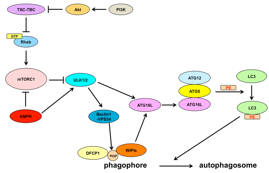 Figure 1. Mechanisms of autophagy. The PI3K-Akt pathway inhibits the TSC-TBC complex, which inhibits Rheb; therefore, inhibition of the TSC-TBC complex results in the activation of Rheb when Rheb is converted from the GDP-bounded form to the GTP-bounded form. GTP-loaded Rheb activates mTORC1 and inhibits the ULK1/2 complex, leading to the inhibition of the autophagic flux. On the other hand, AMPK inhibits mTORC1 and activates the ULK1/2 complex. Stresses, such as the accumulation of denatured or aggregated proteins, damaged organelles, and reactive oxygen species, inhibit mTORC1 or activate the ULK1/2 complex, resulting in the induction of autophagy. The ULK1/2 complex activates the Beclin1-VPS34 complex and ATG16L. The activated Beclin1-VPS34 complex functions as a class III PI3K to produce PI3P. WIPI proteins and DFCP1 are recruited to PI3P to generate a phagophore. WIPI proteins also activate ATG16L. ATG16L forms the ATG12–ATG5–ATG16L complex with ATG12 and ATG5. The ATG12–ATG5–ATG16L complex conjugates PE to LC3 to expand the phagophore and form an autophagosome. TSC: tuberous sclerosis; TBC: Tre2-Bub2-Cdc16; Rheb: Ras homolog enriched in brain; mTORC1: the mammalian (or mechanistic) target of rapamycin complex 1; ULK1/2: Unc-51-like kinase 1/2; PI3P: phosphatidylinositol 3-phosphate; WIPI: WD-repeat protein interacting with phosphoinositides; DFCP1: double FYVE domain-containing protein 1; PE: phosphatidylethanolamine.