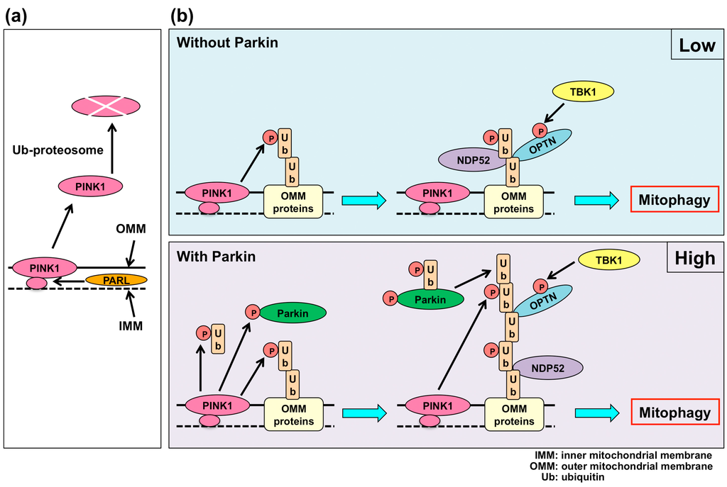 Figure 2. Mitophagy with PINK1 and Parkin. (a) When mitochondria are healthy, PINK1 is processed by PARL in mitochondria, and the processed PINK1 is degraded by the ubiquitin-proteasome system; and (b) When mitochondria are depolarized, PINK1 stays on the OMM. PINK1 phosphorylates ubiquitin, which is originally linked to an OMM protein. Without Parkin, NDP52 and OPTN can bind a phospho-ubiquitin-linked OMM protein and induce mitophagy. Autophagic flux is low under these conditions. With Parkin, PINK1 phosphorylates ubiquitins and Parkin. Parkin is activated by phosphorylation and binding with phosphorylated-ubiquitin. The activated Parkin adds ubiquitins to a phospho-ubiquitin-linked OMM protein, and PINK1 phosphorylates ubiquitins in a polyubiquitinated OMM protein. NDP52 and OPTN bind the polyubiquitinated OMM protein and induce mitophagy. Autophagic flux is high under these conditions. The phosphorylation of OPTN by TBK1 enhances the binding ability of OPTN to ubiquitinated-OMM and LC3. PINK1: phosphatase and tensin homolog (PTEN) induced putative kinase 1; PARL: presenilin-associated rhomboid-like; IMM: inner mitochondrial membrane; OMM: outer mitochondrial membrane; NDP52: nuclear dot protein 52 kDa; OPTN: optineurin; TBK1: TANK-binding kinase 1; P: phosphorylation.