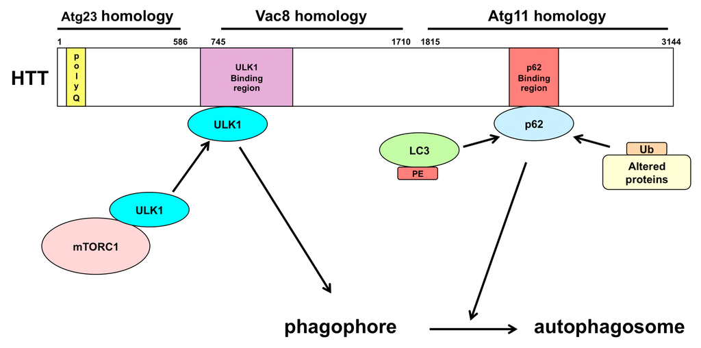 Huntington’s disease is an autosomal-dominant neurodegenerative disease caused by a cytosine-adenine-guanine (CAG) expansion encoding a polyglutamine (polyQ) at the N-terminus of huntingtin (HTT) and is characterized by motor dysfunctions, cognitive disability, and psychiatric disturbance [113,114]. Dysfunction of HTT results in neurodegeneration, indicating that HTT is essential for neurons [115,116]. HTT is a large and a flexible protein, and thus it can act as a multifunctional protein and play an important role in multiple cellular pathways by interacting with various proteins [117]. The polyQ region in HTT affects the structure of HTT and the interaction between HTT and other proteins, possibly leading to changes in cellular pathways [118,119]. HTT is similar to three different autophagic proteins in yeast: Atg23, Vac8, and Atg11 [120,121]. Furthermore, HTT plays an important role in autophagy by interacting with ULK1 and p62 [122] (Figure 3). HTT competes with mTOR for ULK1 and can induce autophagy by releasing ULK1 from mTORC1, which inhibits the activity of the ULK1/2 complex. HTT also binds to p62, which links ubiquitinated substrates and LC3 to bring them to an autophagosome. It has been shown that the deletion of polyQ in HTT enhances neuronal autophagy [123]. Thus, the conformational modification of HTT by polyQ expansion can restrain the autophagic pathways in the neurons and leads to neurodegeneration.