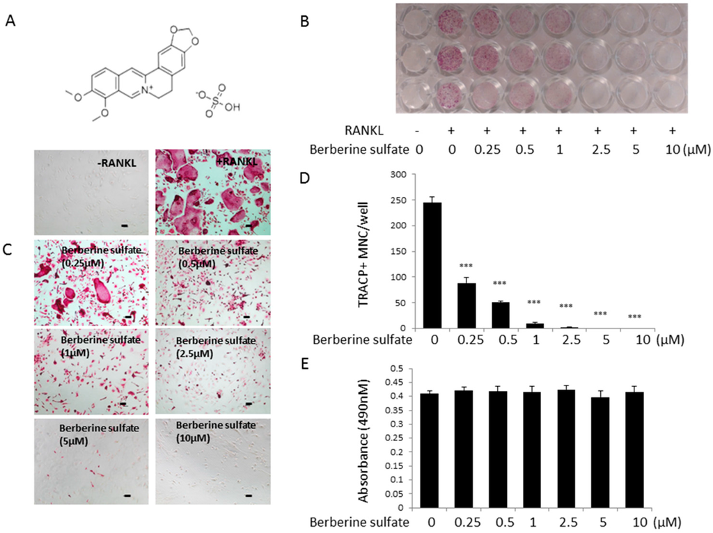Berberine sulfate inhibits RANKL-induced osteoclastogenesis in BMM cells. (A) Chemical structure of berberine sulfate. The molecular weight of berberine sulfate is 433.43; (B) The 96 well-plate showing the effects of different concentration of berberine sulfate on the BMMs derived osteoclast-like cell formation. BMM cells (6 × 103 cell/well) were cultured in the presence of M-CSF and GST-rRANKL (50 ng/mL) with or without different concentration of berberine sulfate for five days. Then, the cells were stained for TRAcP. “−“ means RANKL untreated; and“+” means RANKL treated; (C) Enlarged images of B (scale bar: 100 µm); (D) Osteoclast cell counts showing TRAcP-positive multinucleated cells. (n = 3); (E) Effect of berberine sulfate on the viability of BMM cells as measured by MTS assay. (n = 3). *** p < 0.001 (versus RANKL-treated control).