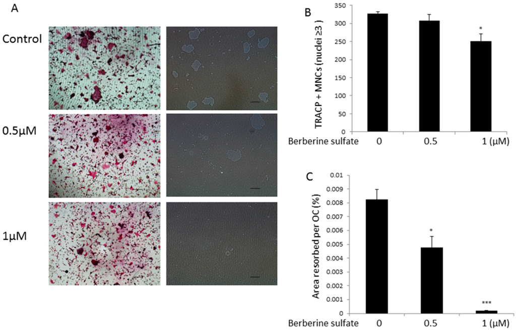 Berberine sulfate suppresses osteoclast function. (A) Representative images of osteoclastic resorption and TRAcP staining on hydroxyapatite coated surfaces (Scale bars, 500 µm); (B) The effect of berberine sulfate on the number of TRAcP positive multinucleated cells (Nuclei ≥ 3, counted as osteoclasts); (C) Percentage of the area of hydroxyapatite surface resorbed per osteoclast. * p < 0.05, *** p < 0.001 relative to untreated controls.