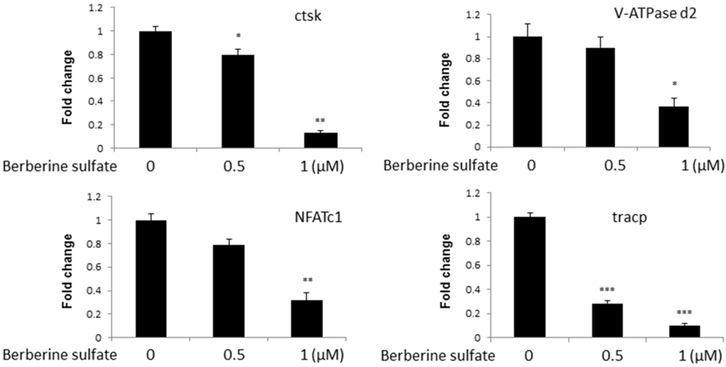 Effect of berberine sulfate on mRNA levels of osteoclast-associated genes. Real time-PCR analysis was performed to examine osteoclast-specific gene expression (Ctsk, V-ATPase d2, NFATc1, and TRAcP), and results were normalized to the expression of GAPDH. * p < 0.05, ** p < 0.01, *** p < 0.001 compared with untreated control.