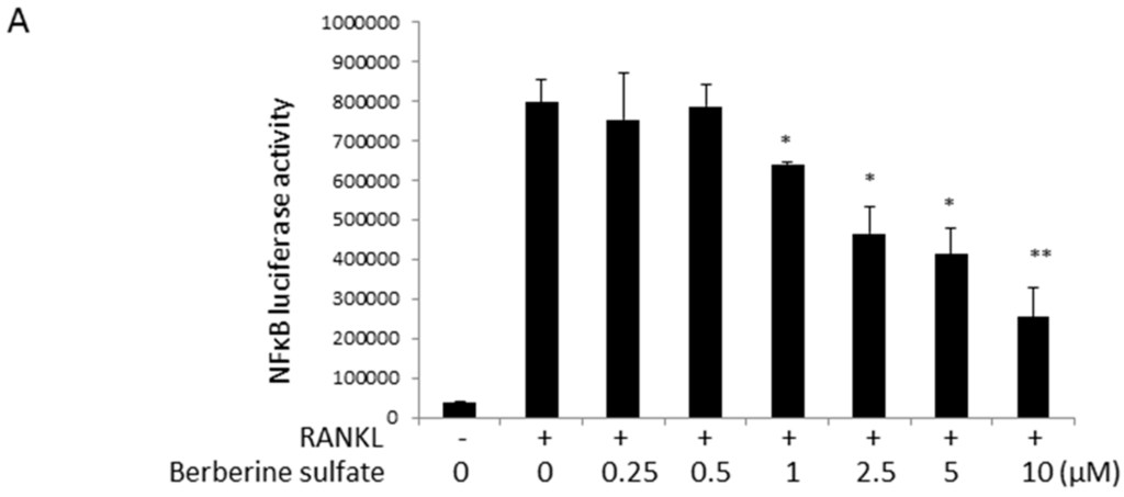 In search for natural compounds that can inhibit osteolysis, we have conducted drug screening using combined osteoclastogenesis assays, and NF-κB and NFAT luciferase reporter gene assays. To this end, we have identified novel compounds that inhibit osteoclast formation and osteolysis [13,14]. In this study, we found that berberine sulfate, a derivative formula of unsulfated berberine that is easily absorbed, inhibits osteoclast differentiation. In addition, we determined the inhibitory effects of berberine sulfate on RANKL-induced osteoclast marker genes expression and NF-κB and NFAT pathways. Our results suggest a potential role for berberine sulfate in the treatment of osteoporosis.
