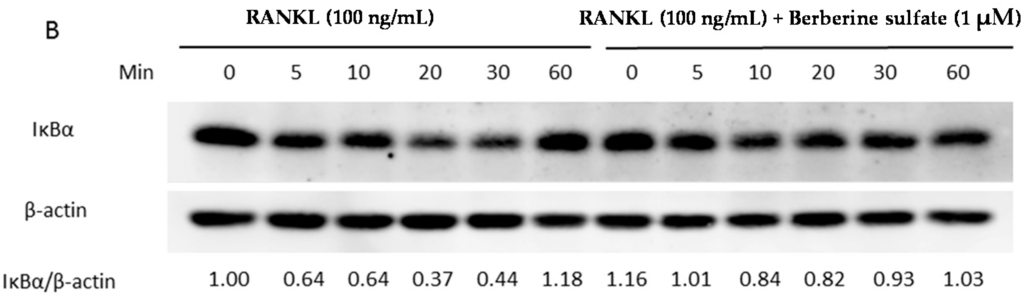 Berberine, an isoquinoline derivative alkaloid, is isolated from several natural herbs, such as Cortex phellodendri (Huangbai) and Rhizomacoptidis (Huanglian). Berberine has multiple pharmacological effects, including anti-bacterial [5], anti-tumour [6], and apoptosis-induction actions [7,8,9] but is poorly absorbed into the bloodstream when taken orally. Previous studies also suggested that berberine inhibits osteoclast formation and bone resorption [10], bone loss in ovariectomized (OVX) rats [11], and NF-κB and Akt pathways in osteoclasts [12].