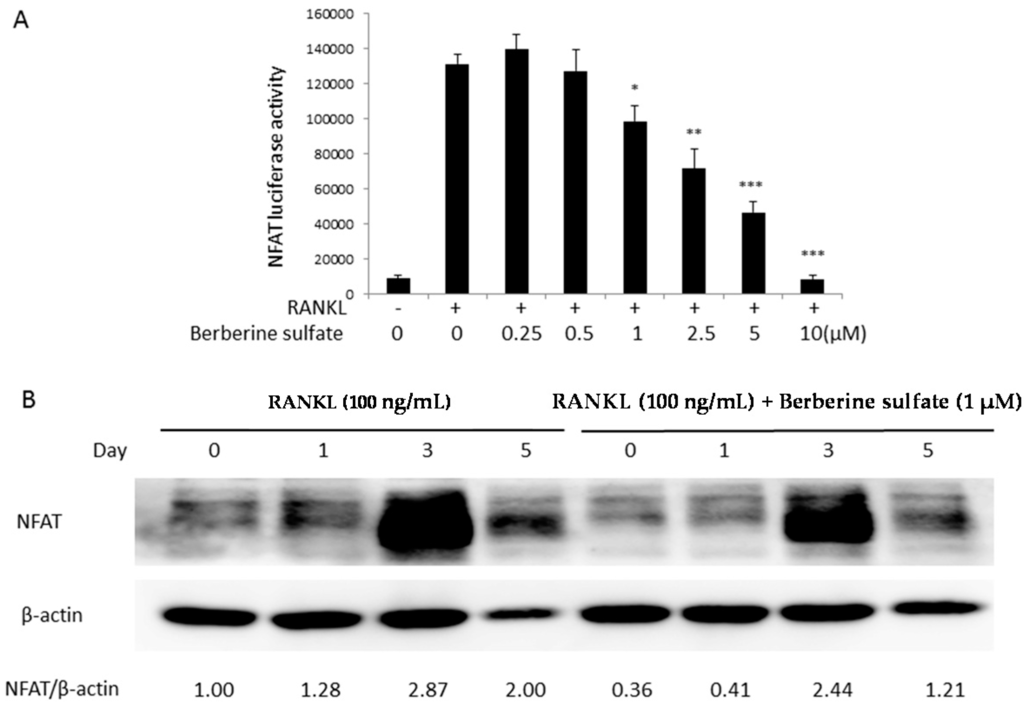 To explore the molecular mechanism of action by which berberine sulfate inhibits osteoclast formation, the effects of berberine sulfate on RANKL-induced NF-κB and NFAT activities were tested using luciferase reporter gene assays. RAW264.7 cells stably transfected with a NF-κB luciferase reporter construct were seeded in 48 wells at 1.5 × 105 cells/well and RAW264.7 cells stably transfected with an NFAT luciferase reporter construct were seeded at a density of 5 × 104 cells/well and left overnight to attach. The next day, the cells were pre-treated with berberine sulfate for one hour, and then stimulated with RANKL for six hours for NF-κB luciferase assay and 24 h for NFAT luciferase assay, respectively. Our results showed that berberine sulfate significantly inhibited NF-κB (Figure 4A) and NFAT (Figure 5A) activities from the dose of 1 µM, with an IC50 of approximately 5 µM.