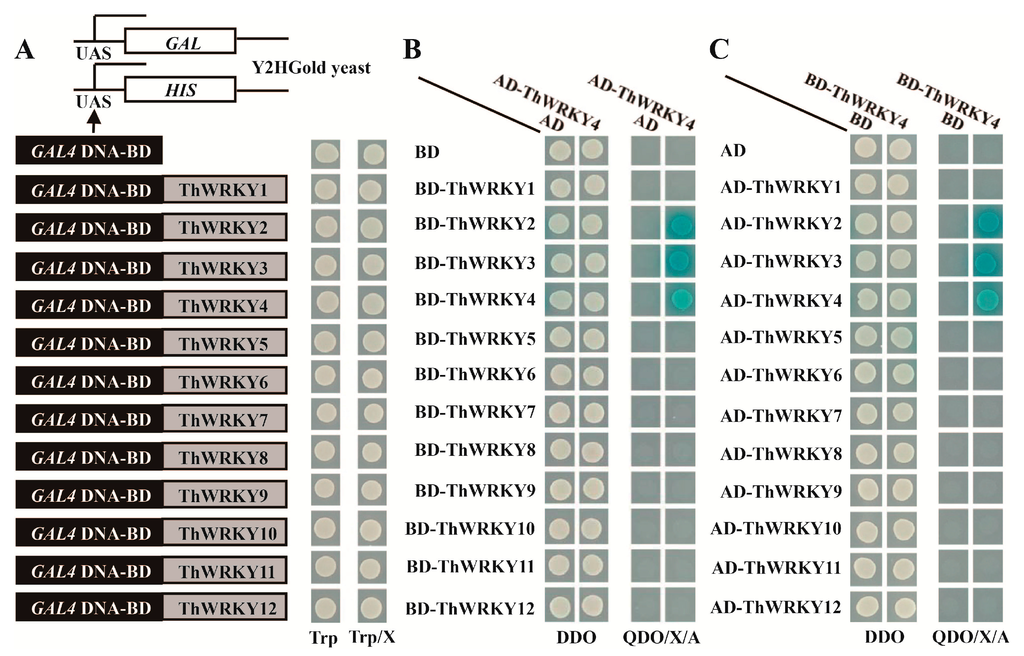 Yeast two-hybrid (Y2H) analysis of the dimerization of ThWRKY4. (A) Diagram of the ThWRKYs that were fused to the GAL4 DNA binding domain in the yeast pGBKT7 vector. The transformed yeast culture was dropped onto SD/–Trp plates with X-α-Gal (Trp/X) to investigate transcriptional activation; (B,C) Protein interactions in yeast two-hybrid systems. Twelve ThWRKY proteins were individually fused to the GAL4 DNA-AD domain in pGADT7 following the above manner. The Y2HGold yeast cells were co-transformed with the indicated plasmids and dropped onto SD/–Leu/–Trp (DDO) and SD/–Ade/–His/–Leu/–Trp/X-α-Gal/Aureobasidin A (QDO/X/A) plates to examine growth at 30 °C for 3–4 days.