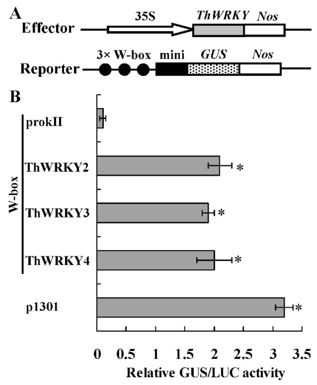 Analysis of the binding of ThWRKY2, ThWRKY3, and ThWRKY4 to the W-box motif in plants. (A) Diagram of the reporters and effectors. Triple tandem copies of the W-box were fused with the 35S CaMV −46 minimal promoter and cloned into pCAMBIA1301 for driving the GUS gene as the reporter construct. The CDSs of ThWRKYs into pROKII under the control of the 35S promoter as the effector constructs; (B) GUS activity assay of the co-expression of effector and reporter plasmids in tobacco leaves. Each effector and the reporter constructs were co-transformed into tobacco leaves. The 35S-luciferase construct was transformed together with the reporter and effector into leaves to normalize for transformation efficiency. The error bars were standard deviations, which were calculated from three independent biological repeats. * indicates a significant difference (p < 0.05).