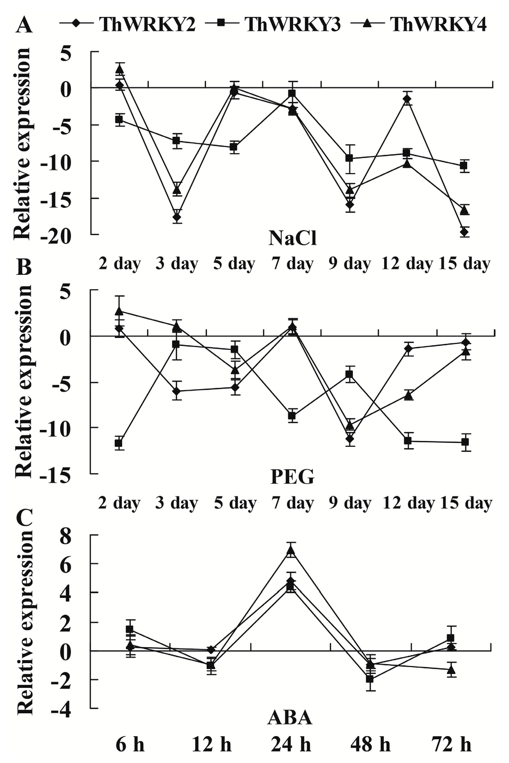 Expression profiles of ThWRKY2, ThWRKY3 and ThWRKY4 under different abiotic stresses. Uniformly developed 6-month-old T. hispida seedlings were treated with 300 mM NaCl (A), 15% (w/v) PEG6000 (B) or 100 μM ABA (C) for the indicated times. A fresh water-only control was conducted in parallel. After these treatments, the roots of seedlings from each sample were harvested and pooled for real-time RT-PCR analyses. The error bars were standard deviations, which were calculated from multiple replicates of real-time PCR.