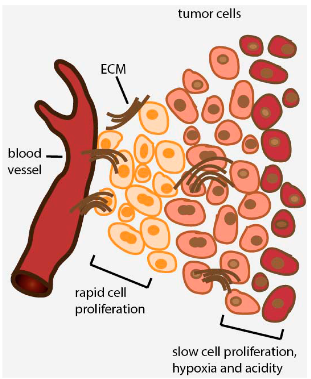 Proliferating tumor cells exist in a fine balance between nutrient supply and demand. Growing tumor cells generally outgrow the supporting vasculature, ultimately leading to cell populations distantly situated (>100 μm) from blood vessels []. The vasculature at the tumor site is generally poorly organized [] with a high degree of compression on the supplying blood vessels, leading to the disrupted flow of nutrients and oxygen to the tumor tissue []. In addition, the insufficient perfusion between vessels and tumor tissue, combined with the high production of acidic metabolites, contributes to the development of regions of high acidity within solid tumors []. As a consequence, the majority of solid tumors will display regions of increased levels of hypoxia coupled with nutrient starvation and low pH [] (Figure 1).