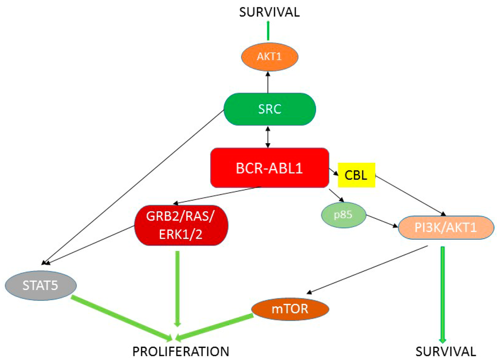 It is believed that the cancer phenotype conferred by BCR-ABL1 is mainly due to its anti-apoptotic, pro-survival properties, but this protein is involved in so many signaling pathways that the complete mechanism of BCR-ABL1 carcinogenicity can be much more complex. Some of the signaling pathways important for the leukemogenic effect of BCR-ABL1 are presented in Figure 2.