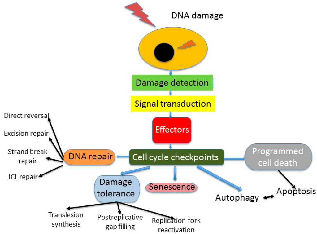 DNA repair is an essential component of the cellular DNA damage response (DDR), a reaction of the cell to deal with endogenous and exogenous genomic insults, which can interfere with the process of transfer of genetic information, disturb the cell cycle, and induce cancer transformation and cell death (Figure 3). Besides DNA repair, DDR includes also mechanisms of tolerance, various modes of programmed cell death and autophagy, which all are associated with cell cycle control []. Although DNA repair may be the most important in DDR and may lead to complete recovery of the cell, it may have various efficacy and accuracy.