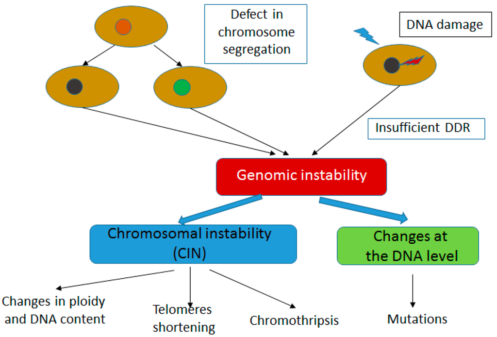 Genomic instability can result from defective chromosome separation, insufficient DNA damage response (DDR) or both. When the extent of endogenous or exogenous DNA damage exceeds the potential of DDR, some DNA damage can remain in the form of chromosomal aberration or changes in DNA sequence. Epigenetic mechanisms contributing to genomic instability are not presented.