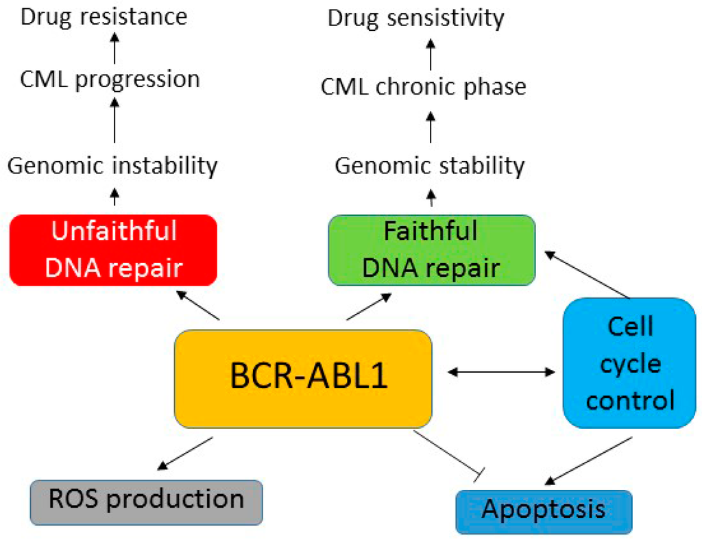Some aspects of the involvement of BCR-ABL1 in the DNA damage response. Anti-apoptotioc effect of BCR-ABL1 is fundamental for conferring chronic myeloid leukemia (CML) phenotype, but the mechanism of progression of CML to blast phase, usually associated with therapeutic drug resistance, is largely unknown. Some experimental data suggest that BCR-ABL1 stimulates the production of reactive oxygen species and unfaithful DNA repair, which may contribute to genomic instability, disease progression and drug resistance.