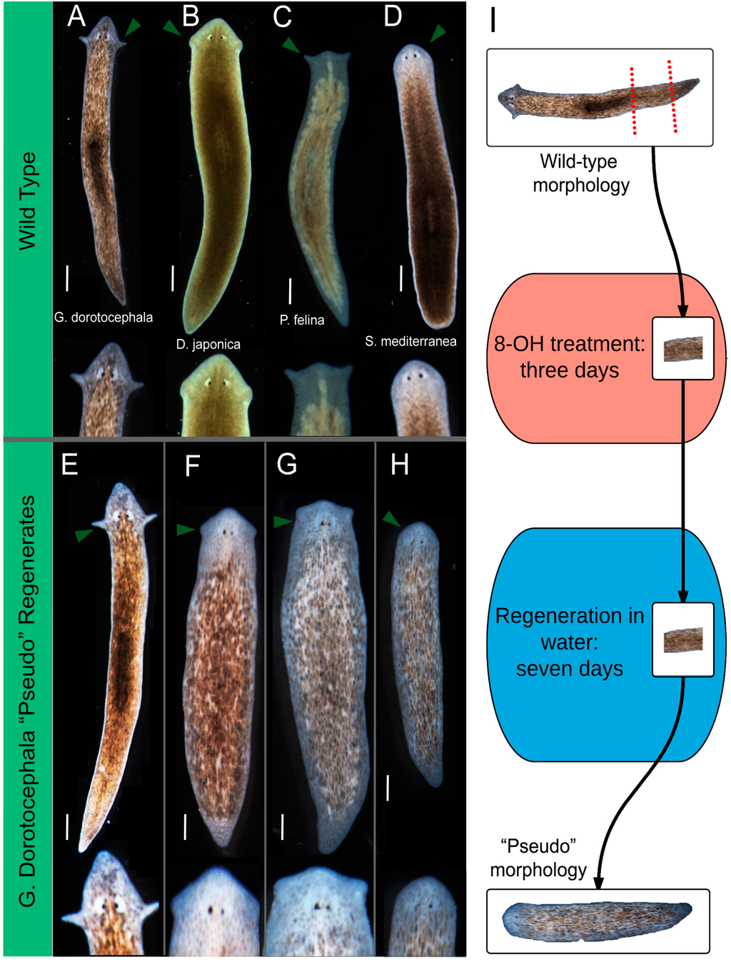 Characterization of varied head morphologies produced by octanol treatment. (A–D) Wild-type morphologies of four species of planaria flatworm. Arrows indicate auricle placement and general head shape; (E–H) pre-tail (PT) fragments of G. dorotocephala, treated in 8-OH for three days, and then moved into water for the remainder of regeneration (n > 243). Arrows indicate auricle placement and general head shape. Scale bar 0.5 mm; (I) Experimental scheme of octanol treatment. PT fragments are amputated from G. dorotocephala worms. Fragments are treated in octanol (8-OH) for three days, and allowed to regenerate in water for seven days.