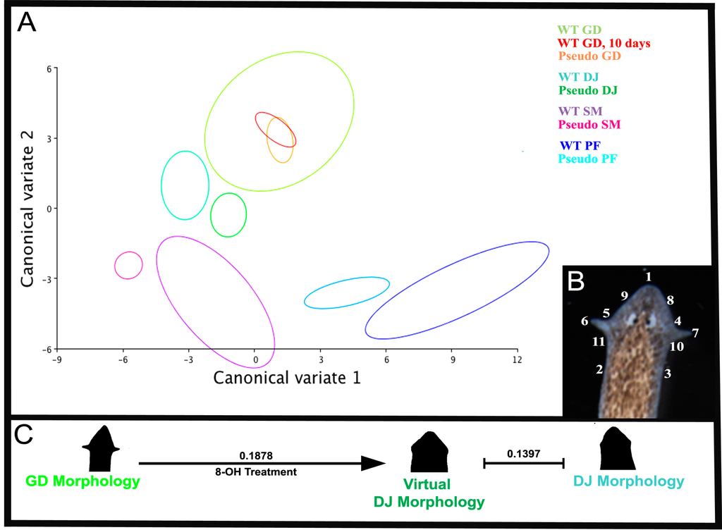 Canonical variate analysis of head shape. (A) Graphical output, showing confidence ellipses for means, at a 0.9 probability, of shape data from wild-type and experimentally derived morphologies. Ellipses are colored to correspond with phenotype and treatment. n = 10 WT G. dorotocephala, n = 8 WT G. dorotocephala 10 days after amputation and regenerated in water, n = 9 WT D. japonica, n = 6 WT P. felina, n = 8 WT S. mediterranea, n = 7 pseudo G. dorotocephala, n = 13 pseudo D. japonica, n = 5 pseudo P. felina, and n = 6 S. mediterranea flatworms were measured; (B) Legend of landmark placement on a wild-type G. dorotocephala head shape (see Materials and Methods); (C) Schematic demonstrating alteration of morphology to better resemble another species after 8-OH treatments. Procrustes distances between wild-type G. dorotocephala, 8-OH treated G. dorotocephala with D. japonica head shape, and wild-type D. japonica show objective alteration of morphology to be more similar to the non-native species.
