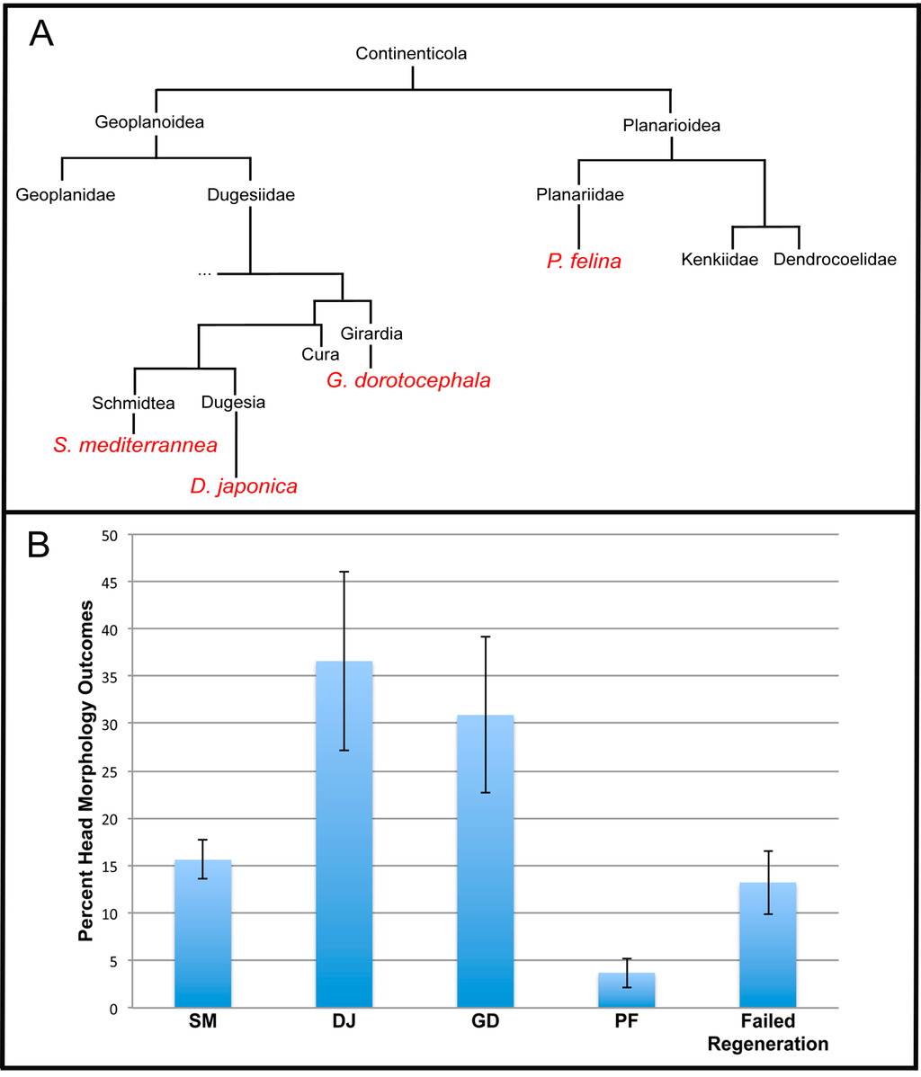 Percentage of head shape outcomes correlates with evolutionary distance. (A) Evolutionary tree, constructed from rRNA data, showing relationships between species of interest. Species names in red are those that were analyzed in this work; (B) Frequency of head shapes obtained in the octanol exposure experiments (n > 243). Failure to regenerate is defined as the loss of anterior-posterior polarity, and the failure to regenerate any head at all after octanol treatment. Error bars are standard deviations.