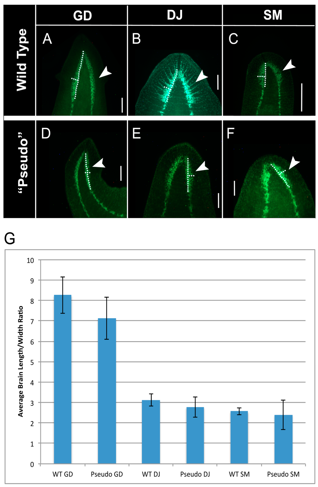 Brain morphology is altered after 8-OH treatment. (A–C) Brain morphology visualized by anti-synapsin staining of wild-type G. dorotocephala (n = 10), D. japonica (n = 15), and S. mediterranea (n = 6) planarians. Arrows indicate brain morphologies, and dotted lines indicate measurements used for calculation of length/width ratio; (D–F) Brain morphologies by anti-synapsin staining of G. dorotocephala regenerates treated in 8-OH that resembled G. dorotocephala heads (n = 4), D. japonica heads (n = 4), and S. mediterranea heads (n = 6). Arrows indicate brain morphologies, and dotted lines indicated measurements used for calculation of length/width ratio. Scale bar 0.5 mm; (G) Average brain length/width ratios of wild-type, and 8-OH treated worms (ANOVA p < 4.9 × 10−14). Error bars are standard deviations.