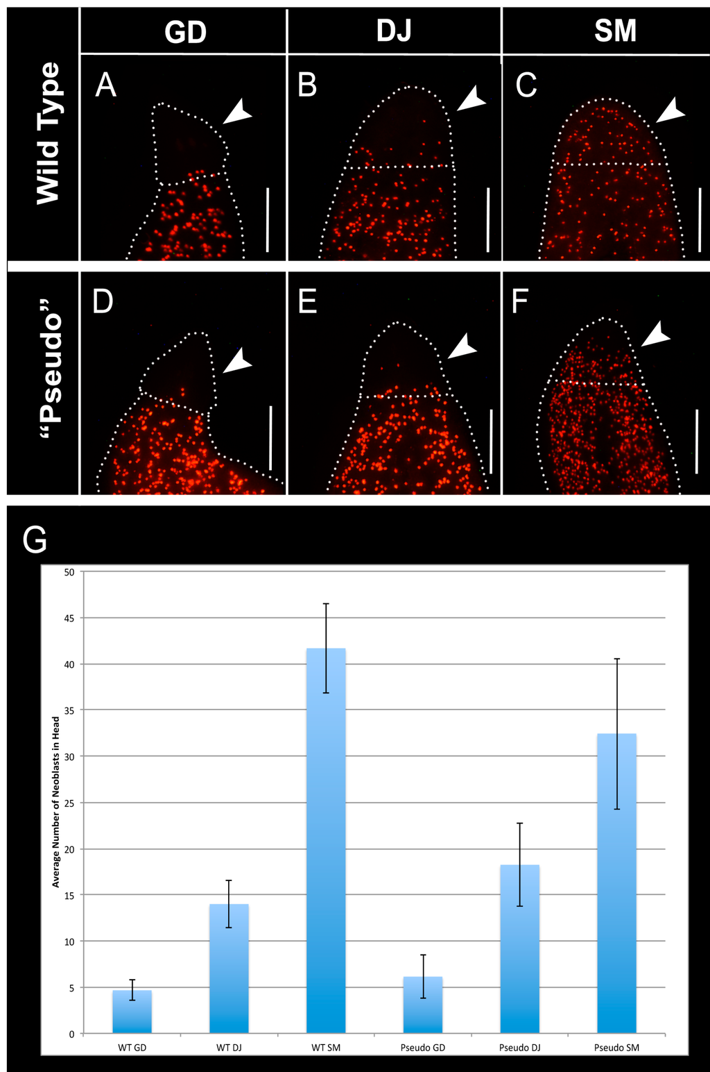 In wild-type G. dorotocephala, very few neoblasts reach into the most anterior 1/6th of the worm (Figure 5A). In wild-type D. japonica, the number of neoblasts in the anterior portion of the body is increased in comparison to G. dorotocephala, however it is still relatively low (Figure 5B). Wild-type S. mediterranea planarians have an abundant neoblast population in the anterior-most region (Figure 5C). All neoblasts in the anterior 1/6th of the worm’s anatomy were counted by hand (Figure 5G). Remarkably, the distribution of neoblasts in pseudo worms mirrored precisely the distribution of neoblasts in the wild-type species that they resembled (Figure 5D‒F) (ANOVA p < 0.05). We conclude that the transformation of G. dorotocephala worms to resemble other species also extends to the species-specific, characteristic internal distribution of their stem cells, and that the patterning processes that are disrupted after GJC perturbation are also responsible for organizing the distribution of mitotically active cells.