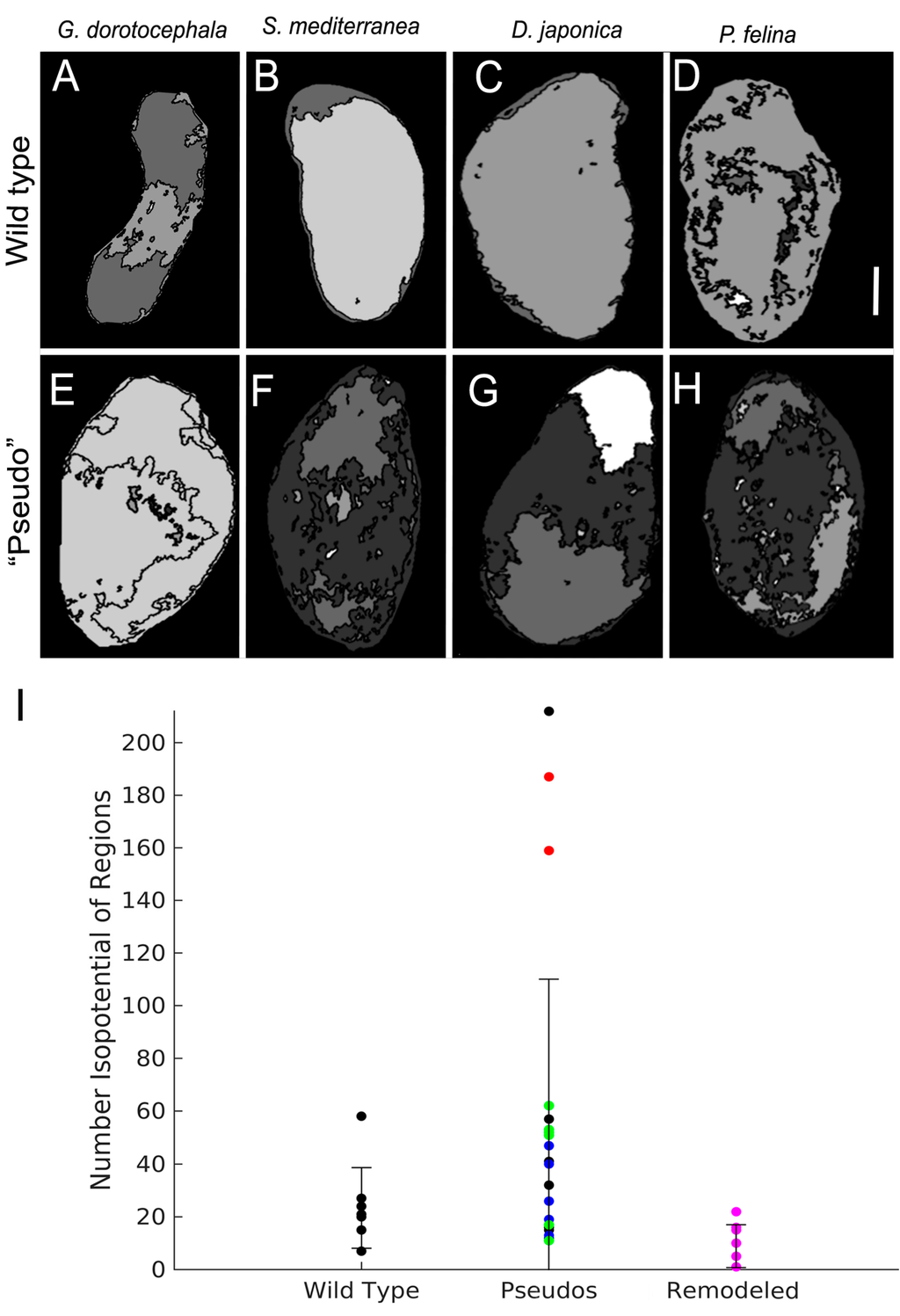 Membrane voltage reporter assay demonstrates long-term change of bioelectrical connectivity in octanol-exposed planaria. (A–D) Domains of relative membrane potential visualized using DiBAC4(3) in wild-type G. dorotocephala, wild-type S. mediterranea, wild-type D. japonica, and wild-type P. feline; (E–H) Domains of relative membrane potential visualized using DiBAC(3) in pseudo G. dorotocephala (GDs), pseudo S. mediterranea (SMs), pseudo D. japonica (DJs), and pseudo P. felina (PFs), respectively. Scale bar 0.5 mm; (I) Number of isopotential regions in wild-type GD worms (control), all pseudo morphologies, and pseudo morphologies that have remodeled back to WT (wild-type) GD morphology after 30 days. After octanol treatment, the number of isopotential regions in pseudo morphologies is increased, but decreases to WT levels after remodeling. Black dots indicate worms with GD morphologies, blue dots indicate DJ morphologies, red dots indicate PF morphologies, green dots indicate SM morphologies, and pink dots indicate pseudo worms that have remodeled their morphologies to resemble wild-type GDs. n = 7 wild-type GD, n = 5 pseudo GD, n = 5 pseudo SM, n = 5 pseudo DJ, n = 2 pseudo PF, and n = 6 remodeled worms. Error bars are standard deviations. Non-parametric statistical analysis was done using a post-hoc comparison of all groups by Kruskal-Wallis test (p = 0.0021), and then between groups using a Dunn’s Multiple Comparison test, which showed differences in voltage domain number between remodeled GDs and pseudo morphologies are statistically significant at p < 0.05.