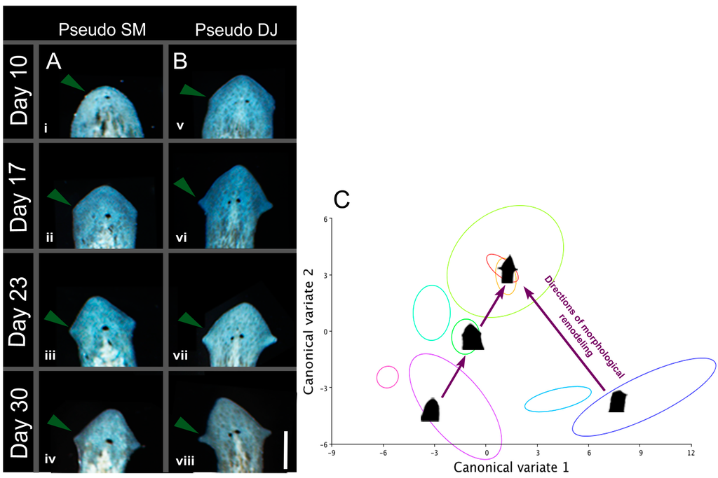Morphology is remodeled over time to resemble native head shape. (A i–iv) G. dorotocephala treated in 8-OH, which regenerated a pseudo S. mediterranea head, tracked over 30 days in water. Arrows indicate auricle elongation; (B v–viii) G. dorotocephala treated in 8-OH, which regenerated a pseudo D. japonica head, tracked over 30 days in water. Arrows indicate auricle elongation. Scale bar 0.5 mm; (C) Schematic demonstrating “paths” of morphological remodeling through the shape space defined in Figure 2.
