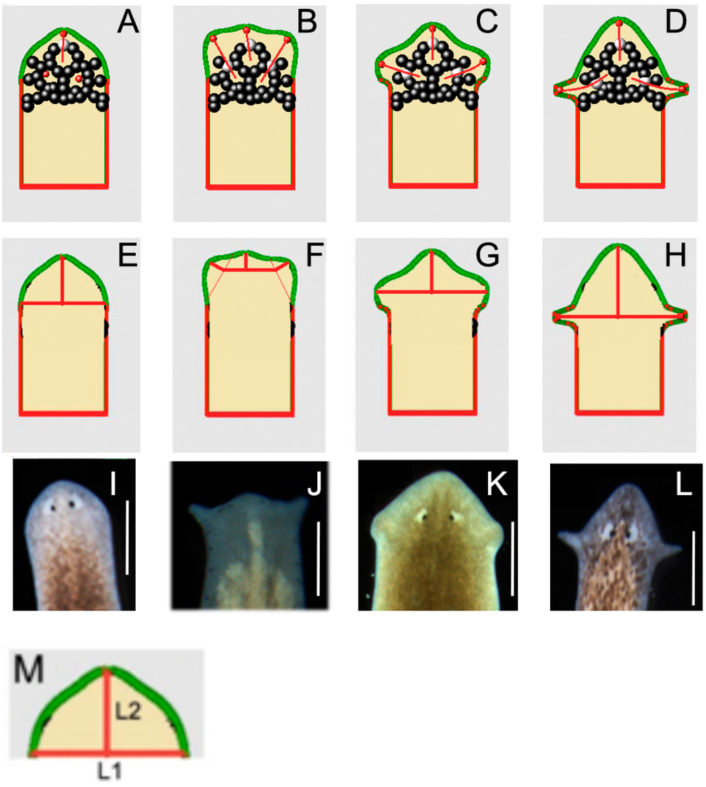 Computational model reproduces the four discrete outcomes observed experimentally. (A–D) Four types of planarian heads obtained from the computational model. Different shapes result due to deactivation of different cells. Red lines show the trajectories of the red cells; (E–H) Morphometric measurement of different planarian heads, for comparison with real heads (I–L) measured (see Table 2). Scale bar 0.5mm. Cells of type A are shown in black, deactivated cells of type A white, cells of type B are red. The outer boundary has two parts differing by its rigidity (soft part of the boundary is shown in red, more rigid part in green). Thus, the red cells represent migrating neoblasts (or their progeny) while the black cells represent somatic cells interconnected by GJs. (M) Definitions of lengths of measurements L1 and L2, used in comparison of real worms to those produced by the model in Table 2.